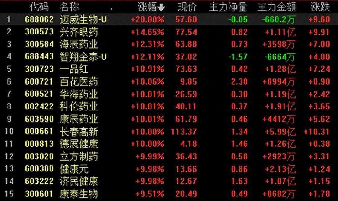 9月1日融亿操盘,创新药概念股异动拉升。迈威生物涨幅高达20cm,百花医药、科伦药业、康辰药业等多股强势封板,兴齐眼药股价大涨超过14%%,海辰药业涨逾12%,一品红、康泰生物等个股也有不错的表现。