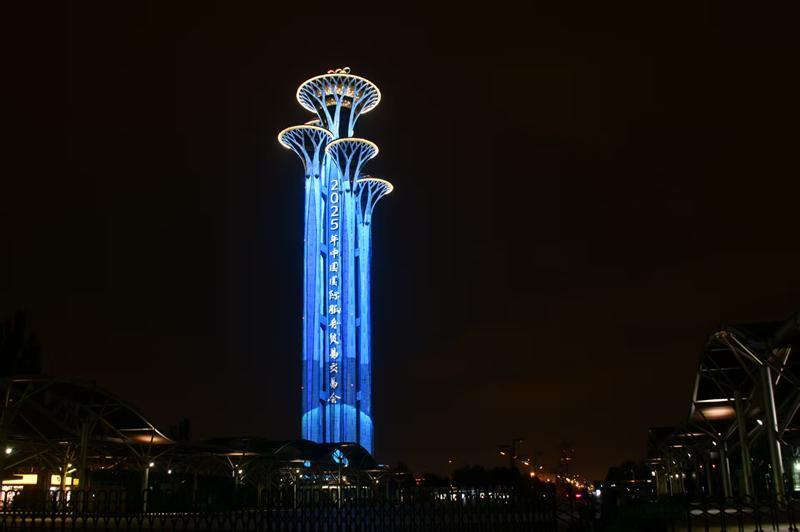 与北京CBD区域遥相呼应的,则是奥林匹克中心区的灯光秀。奥林匹克塔循环播放“2025年中国国际服务贸易交易会”“9月,我在服贸会等你”等字样,在夜色中璀璨夺目;大望京建筑组群上则循环播放“相约服贸会”字样以及服贸会LOGO,传递出首都蓬勃向上的活力和首都人民的热情好客。
